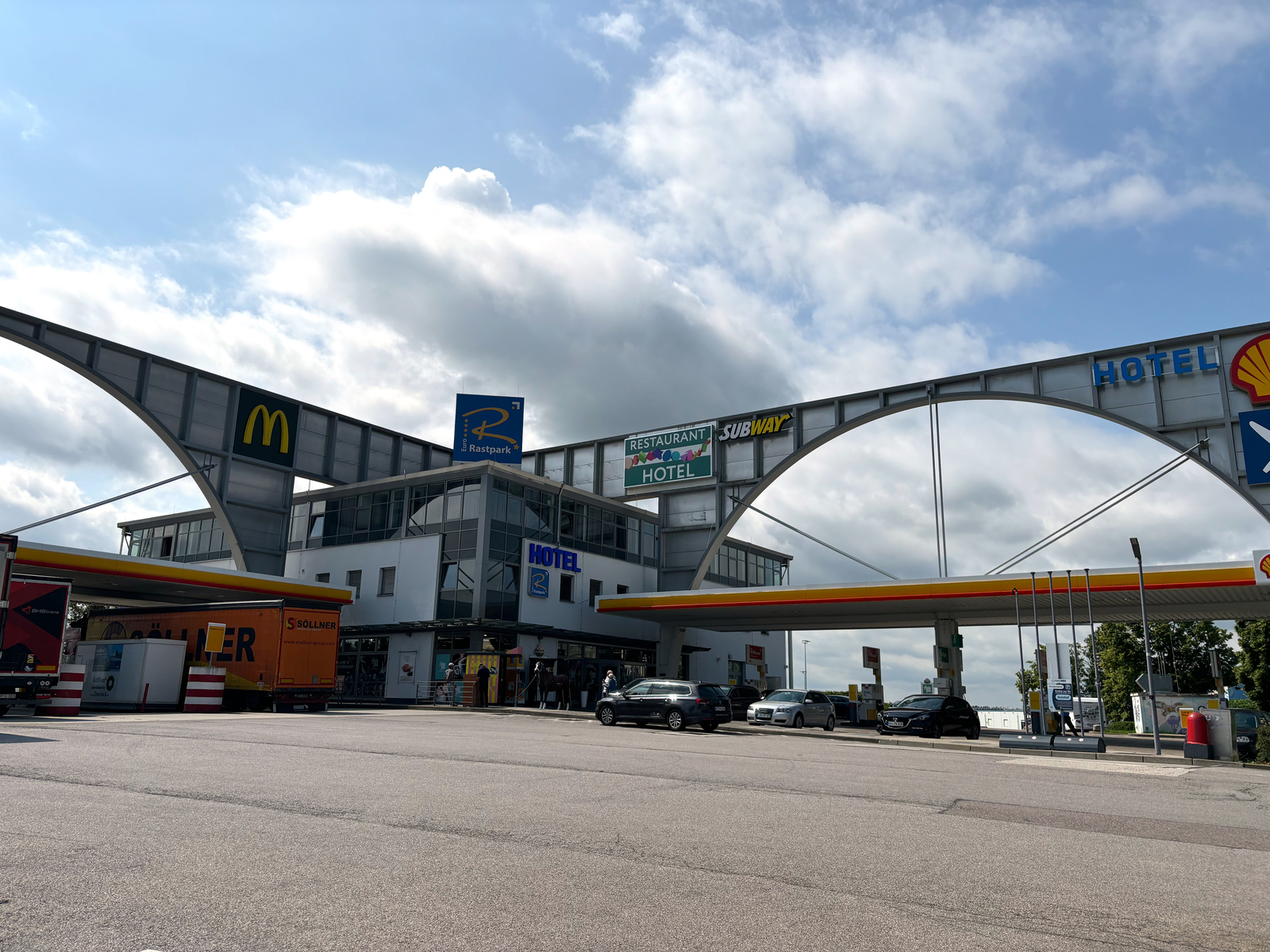 The striking, futuristic silhouette of the motorway service station on a quiet hill above the busy A9 Munich/Nuremberg motorway is familiar to anyone who has ever driven here.